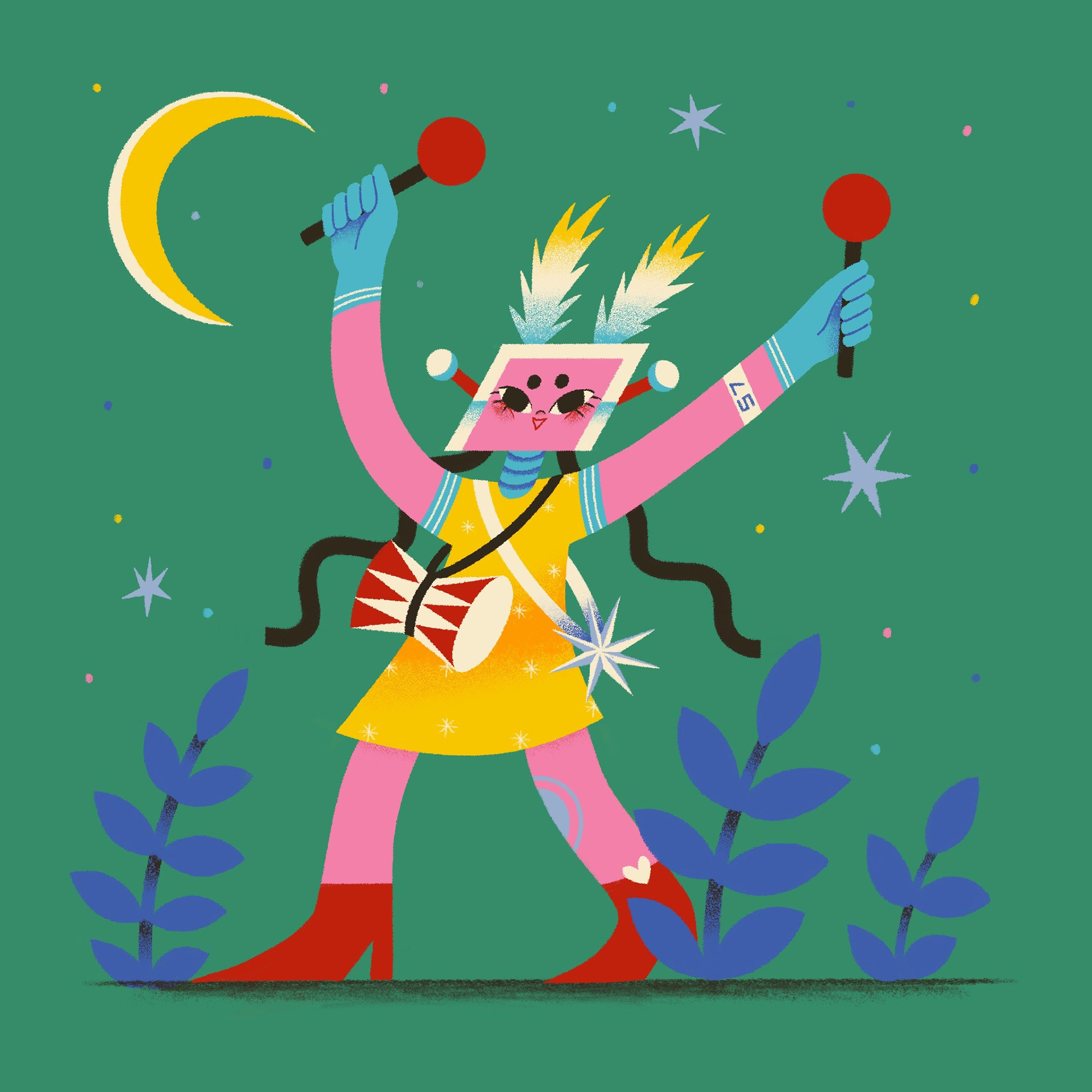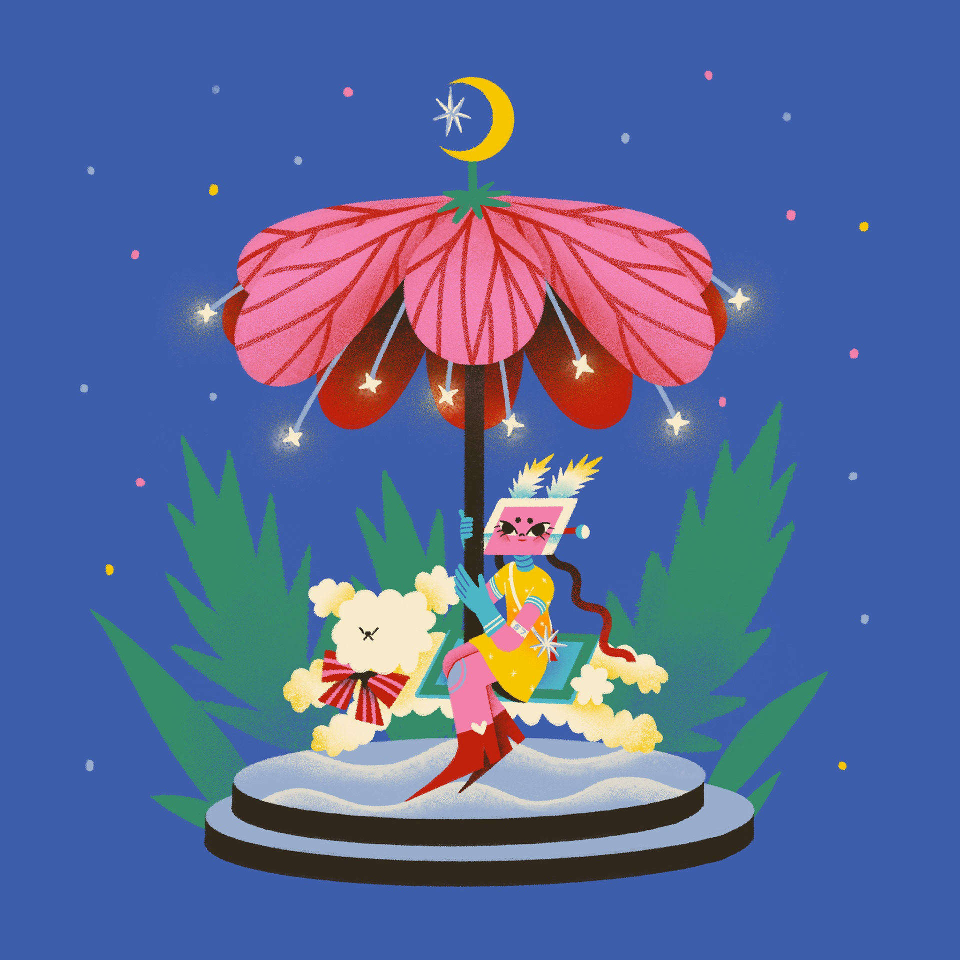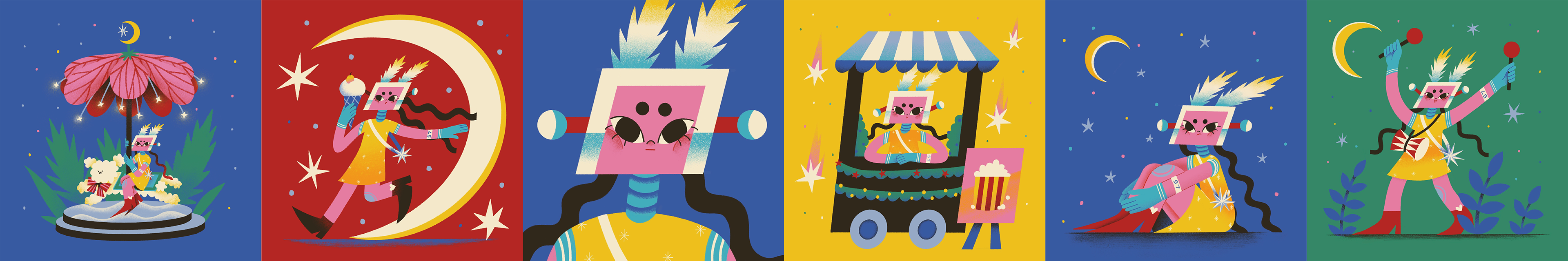 Yeppi is a robot girl who lives in the forest and enjoys her own world. I use bright colors and simple shapes in these illustrations that create a cozy and charming atmosphere.