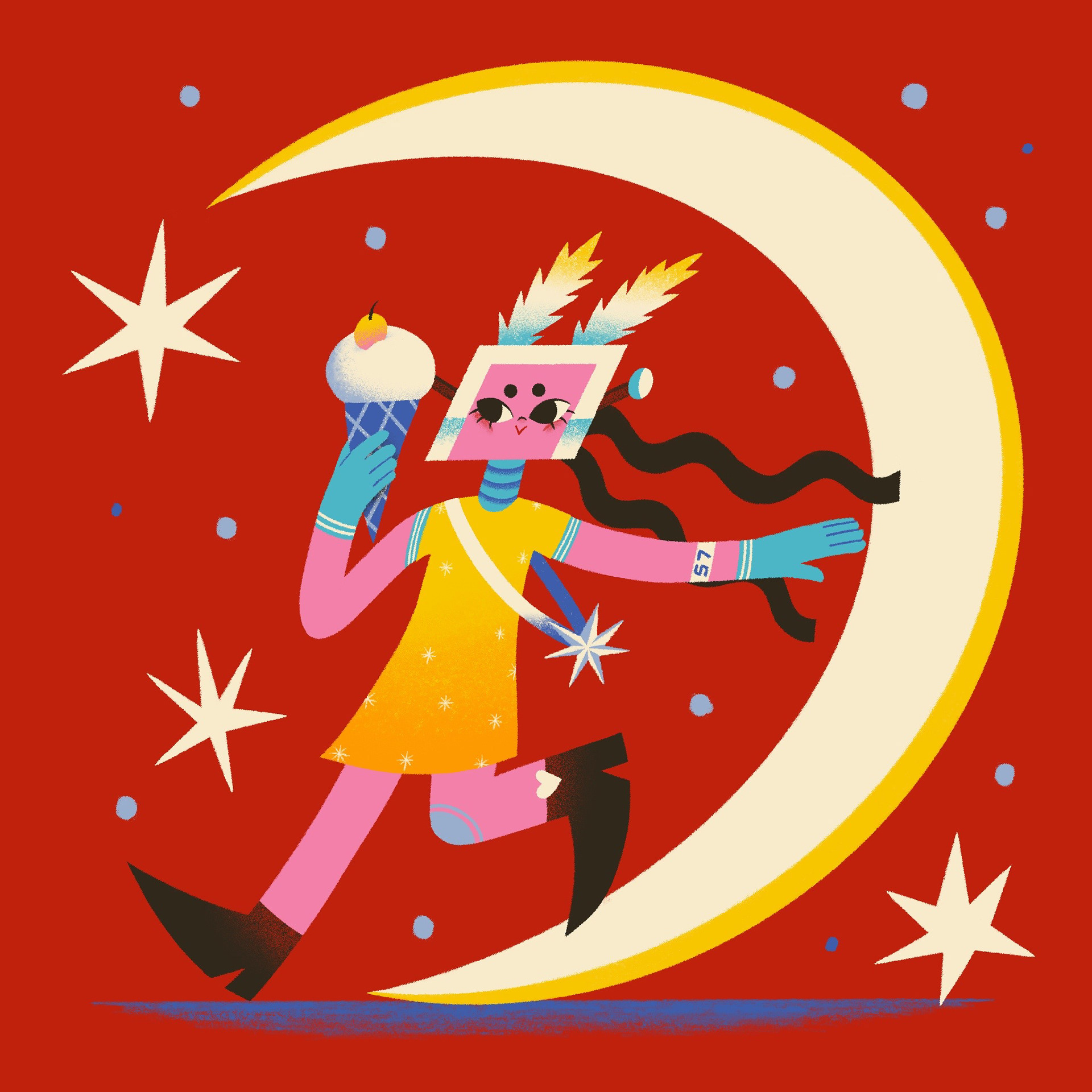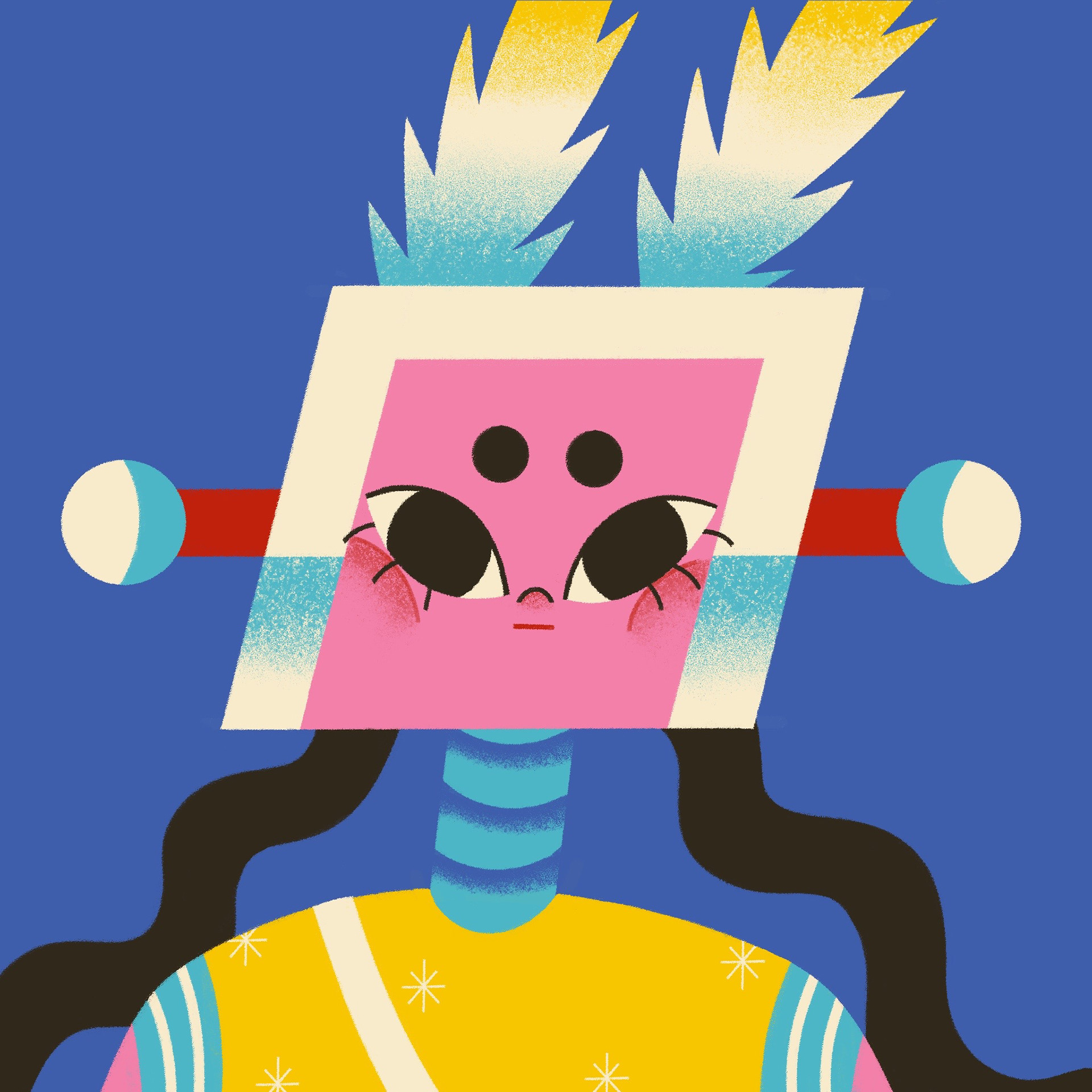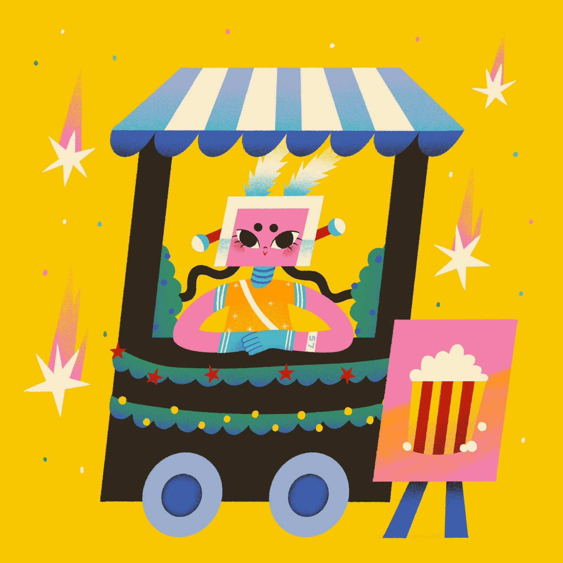 Yeppi is a robot girl who lives in the forest and enjoys her own world. I use bright colors and simple shapes in these illustrations that create a cozy and charming atmosphere.
